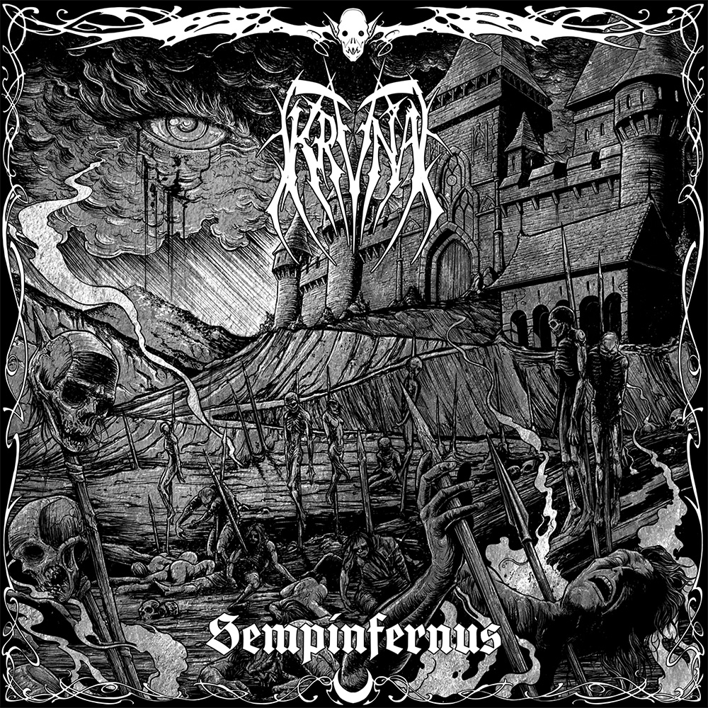 While “Sempinfernus” is not a concept album per se, the songs deal with the myth of the vampire and its various shapes and traditions. During the 36 minutes of this record KRVNA takes us on a beautiful journey through centuries past, from the shades of Hades to the Targovistean nights, where a timeless, ageless Vampire feasts while witnessing the triumph of the flesh over the spirit, as the eve of the eternal sunset is about to descend over the world forever. This whole feeling of impending doom is enhanced by the beautiful black and white cover created by Scourge Tattoo Artist, which captures the exact essence of this record, from the lyrics to the music.