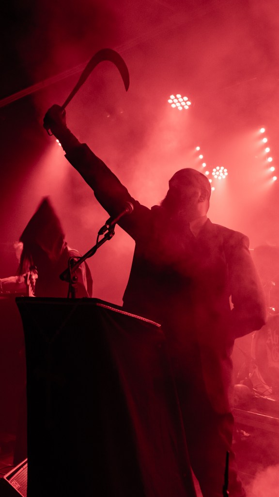 While at some point their music might sound repetitive, the 5 musicians really know how to perform their sinister duties and no effort was spared into making this evening a real “dead” one. Even if they do not communicate with the audience at all, the Italians are masters at creating and maintaining the creepy atmosphere throughout their show with theatrical gestures and inspired stage play. They seem to really live in their moment on stage and they immerse themselves in their roles, transgressing the music and becoming either priests, pallbearers or insane monks. The energy which comes out of the music was felt with great intensity in the audience, people were headbanging or singing along with the vocalist. The band sounds great on disc too, but in a live setting is where they impress the most, as the visuals are perhaps the most important part of their music and their eccentricity is best highlighted through dramatic gestures and grimaces. Speaking of visuals, the lights, the candles, the skulls and the thick smoke played a great role in creating a truly horrific and satanic setting.