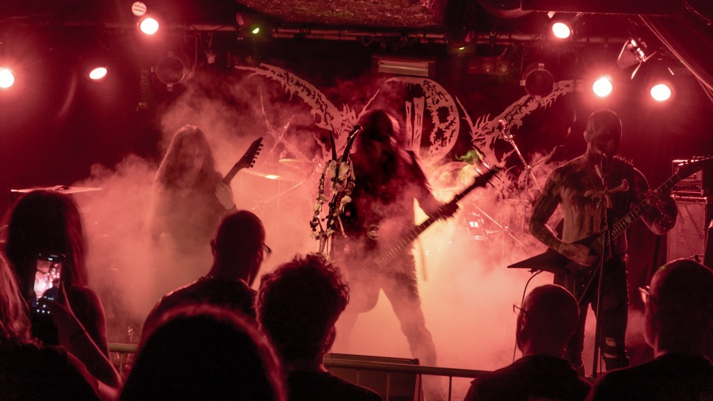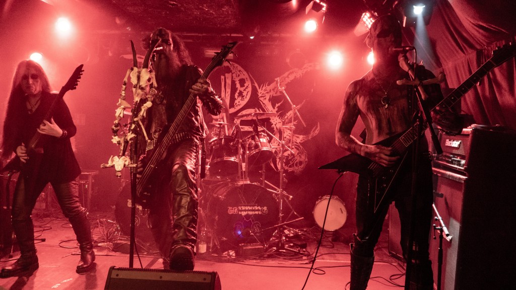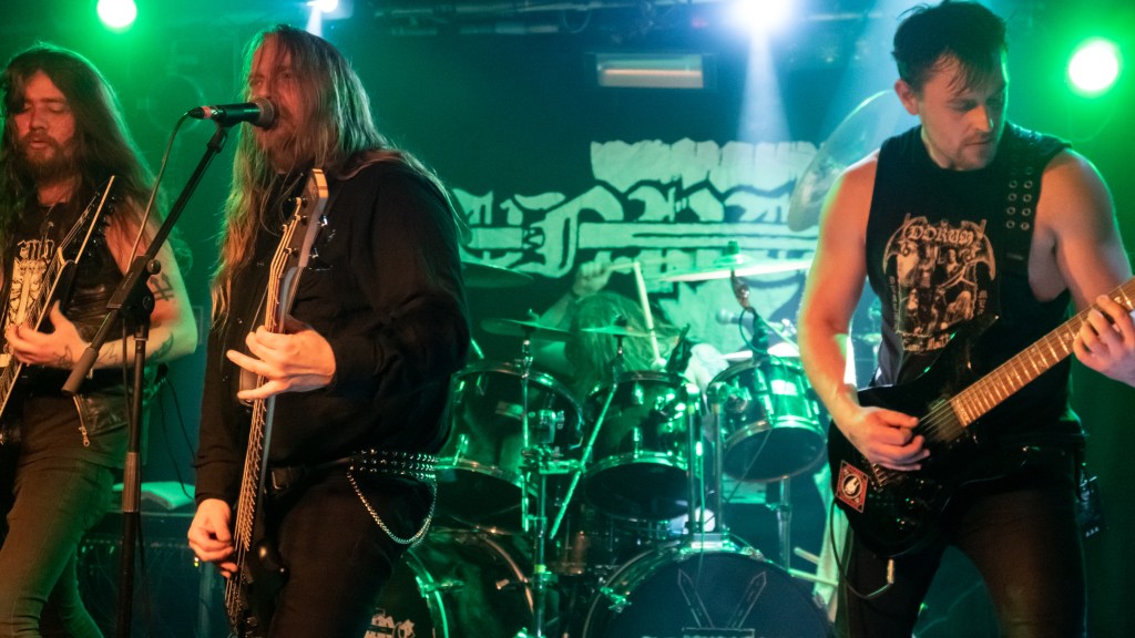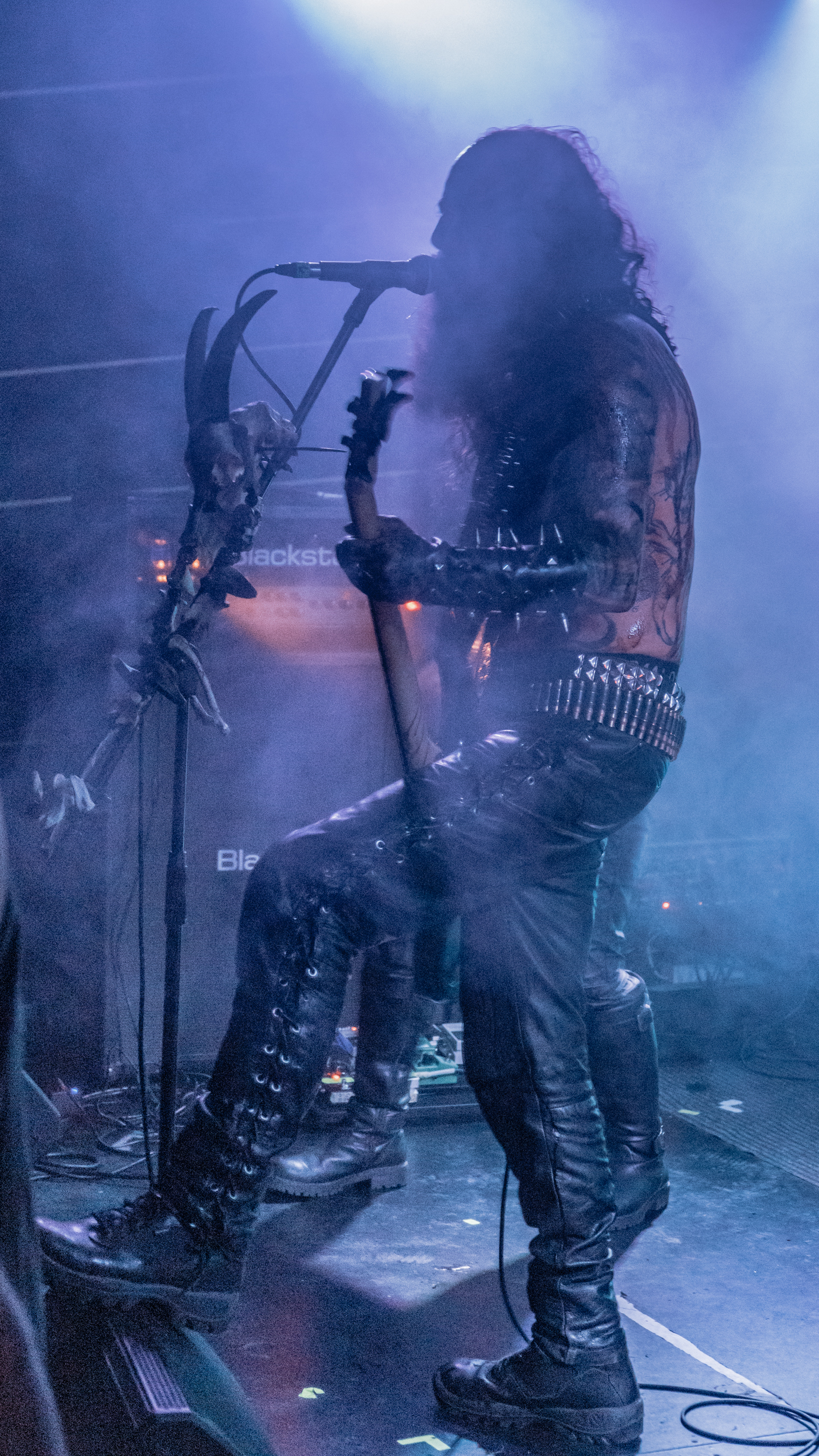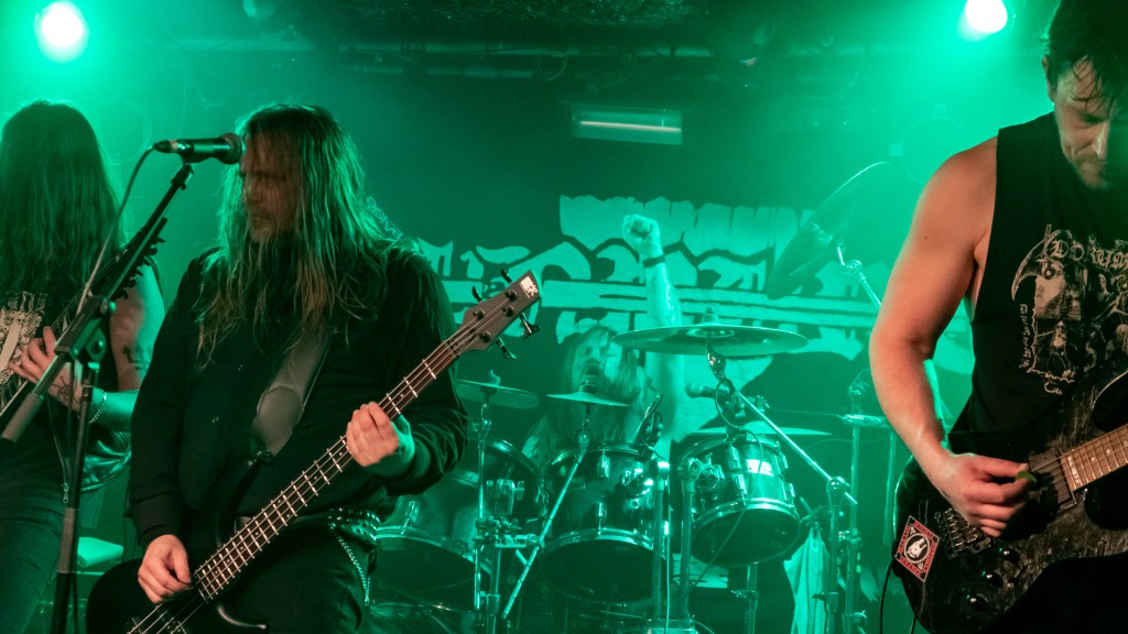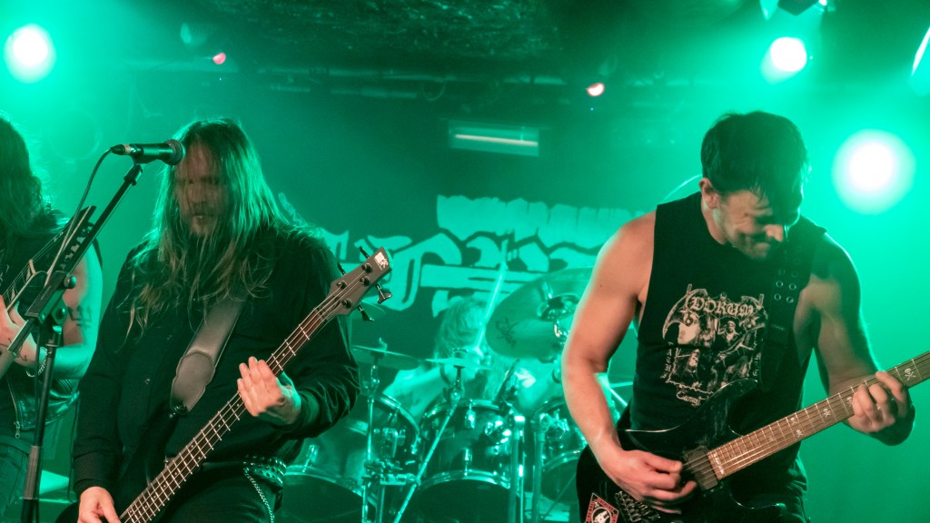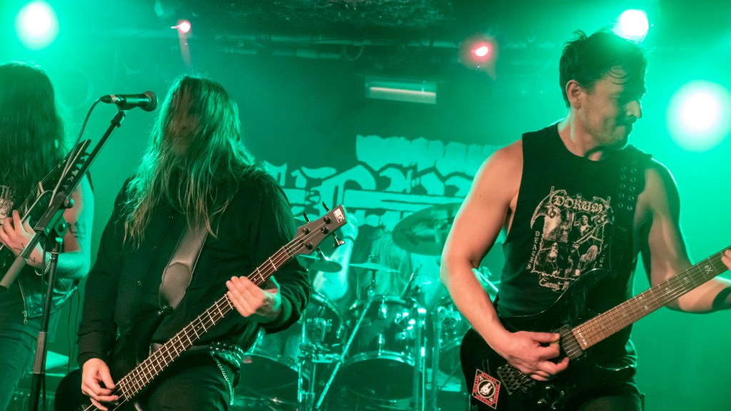 After Otras‘s show and a well deserved change over and sound check, it was time for one of the bands I went there for: the legendary Unpure took the small stage and started their performance with “Megalithic Gateways” and “Northern Sea Madness“, the first 2 songs from their recent album, “Prophecies Ablaze“. I was in the front row and the sound was shitty as fuck, everything was fuzzy and chaotic. At some point during the show Hampus tried to sing on “A Forest Event” but his voice was completely inaudible, nothing came out of the microphone. The band played on, but it was an awkward moment which spoiled this great old track. I was hoping that the sound guy will do something quick to fix the issue, but he didn’t sweat too much about it. Nevertheless, seeing the mighty Kolgrim and Co. delivering the goods in such a glorious way was pure pleasure. I was ecstatic hearing old tracks like “To the Ancients“, “A Forest Event“, “Surrounded by Darkness“, “Count Dracula” or “Forever Lust” along with newer tracks from the recent LP, like “The Witch of Upsala“, “Prophecies Ablaze“, “Beyond the Nightmares” or “Endtime Dictator“. Due to Pelle‘s last minute withdrawal just before the start of the tour, Unpure recruited Matti Jalava (ex Vorum – nice “Current Mouth” shirt man!) on second guitar. He did a very good job on the songs and together with the other guys he was able to sort it out in a professional manner. Useless to say that Emil‘s insane drumming gives the band a dizzying speed which they were never able to attain before.